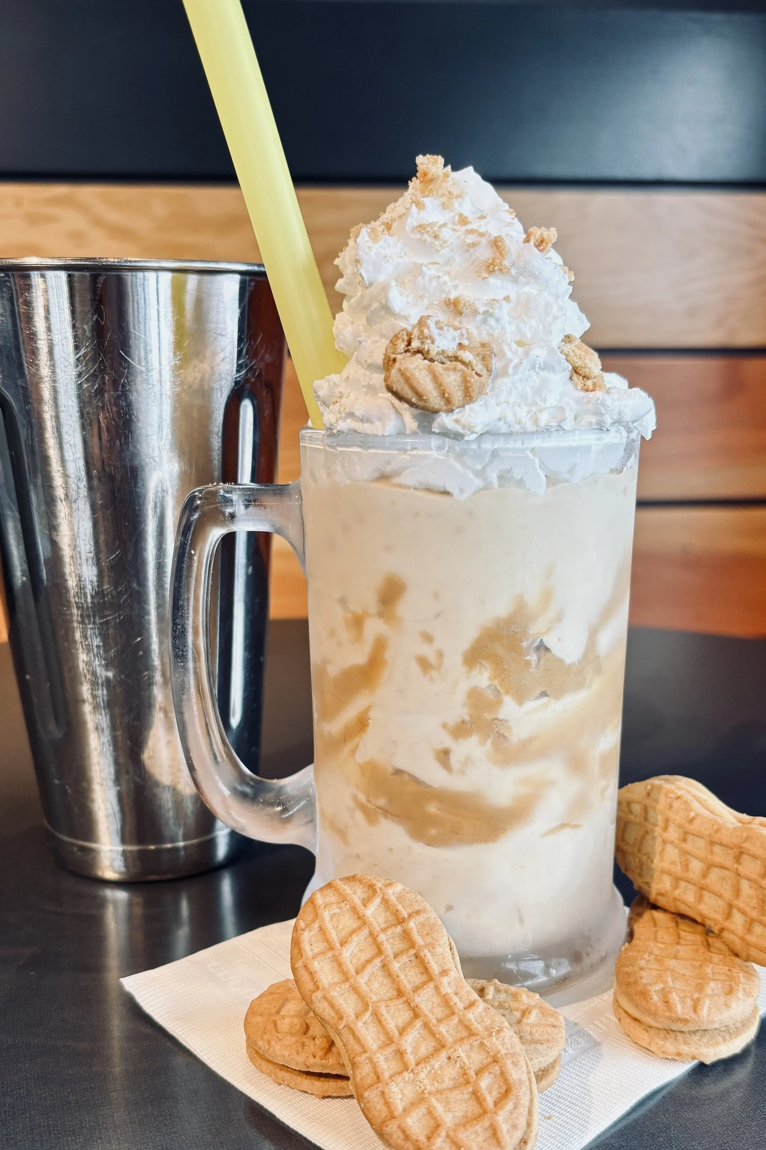 Our FlufferNutter Shake is a nostalgic indulgence turned all the way up—creamy vanilla soft serve blended with swirls of peanut butter and fluffy marshmallow for rich, spoon-licking goodness. Crunchy NutterButter cookie pieces add texture in every sip, while chewy marshmallow bits keep it playful and decadent. Finished with a marshmallow-peanut butter swirl inside the glass and a generous mound of whipped cream on top, this shake is pure comfort (spike it with a splash of bourbon for a grown-up option).
