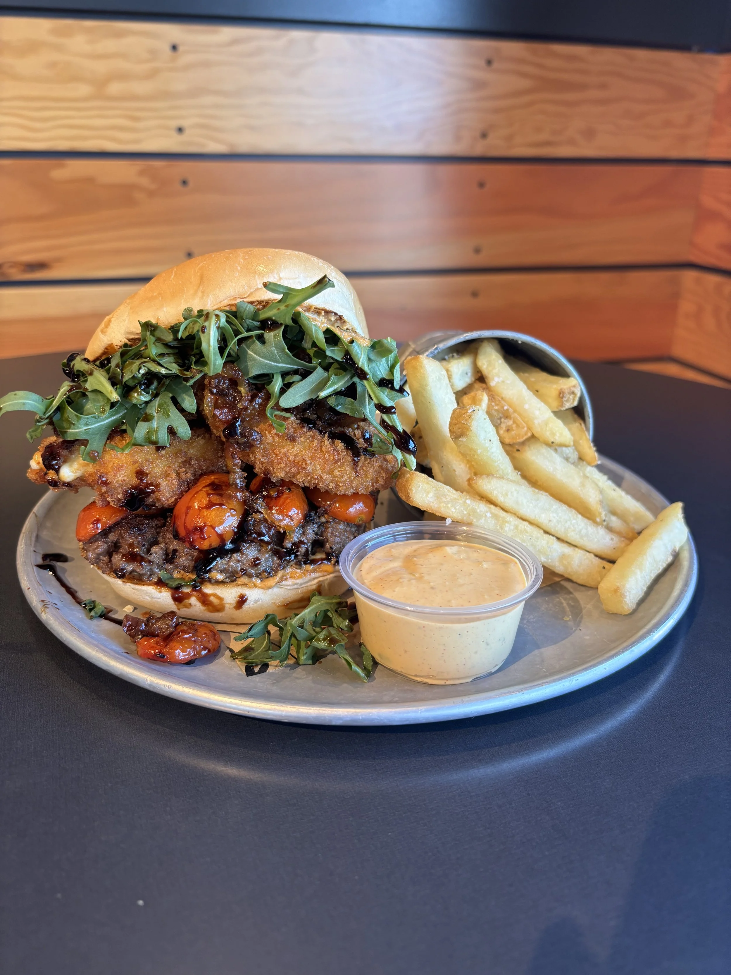 This is a bold, crave-worthy burger that hits all the right notes. A juicy smashed beef patty with a deep golden-brown sear is layered with a molten, crispy fried mozzarella that delivers serious indulgence. Roasted tomatoes add warmth and sweetness, while rich bacon onion jam brings a savory-sweet depth. Peppery arugula gets a light drizzle of balsamic for a bright, tangy finish, all balanced by a generous spread of romesco mayo. It’s stacked high on a toasted potato bun with just the right crunch, creating a bite that’s rich, savory, slightly sweet, and perfectly balanced from start to finish.