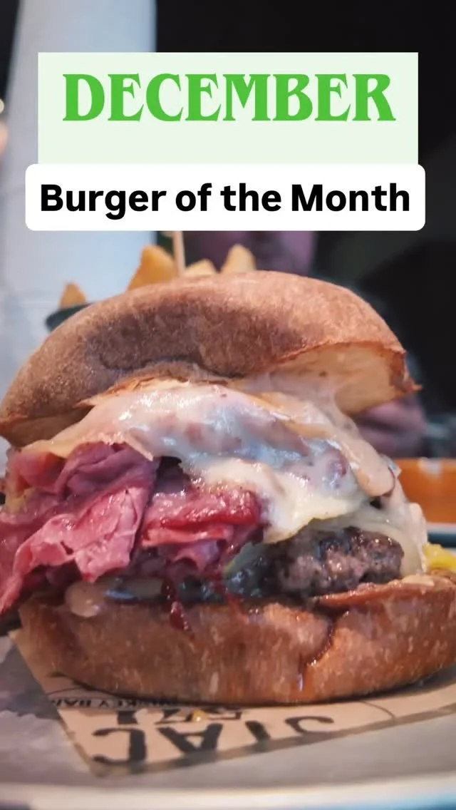 Our Reuben Burger starts with a smashed, juicy beef patty cooked to perfection and layered high with thin-shaved pastrami and warm, crunchy, juicy sauerkraut. Melty Swiss cheese blanket the stack, while tangy Russian dressing coat both sides of a toasted potato bun with a golden crunch. It’s stacked higher than your gift list and wrapped cozier than your favorite winter coat.