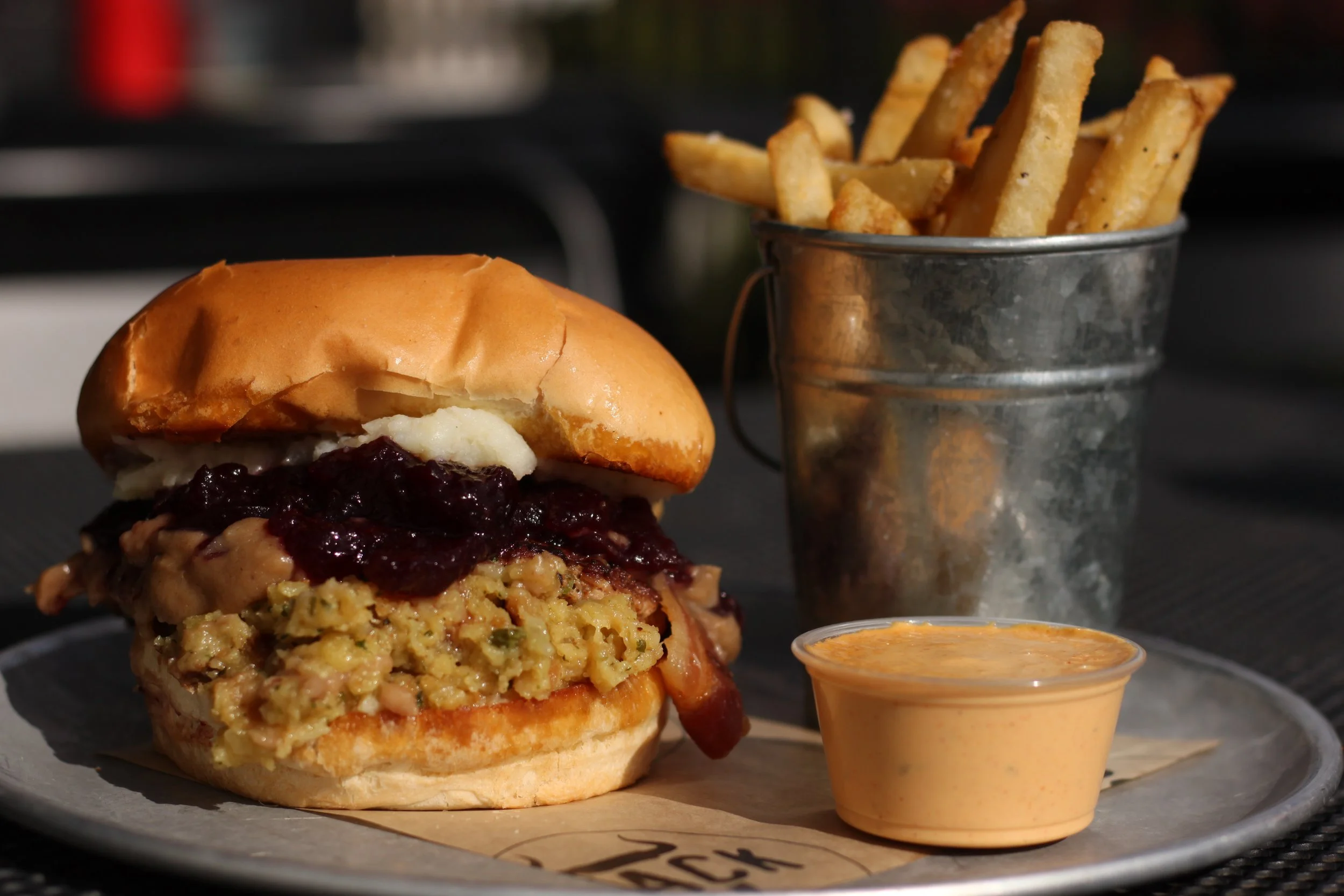 A Thanksgiving feast between two buns—no carving knife required. A juicy sage-and-thyme turkey patty is crowned with creamy Brie and smoky bacon, then draped in rich, savory gravy. Golden mashed potatoes spread on a toasted potato bun create the perfect cushion for a scoop of herbed stuffing. Finished with a tangy cranberry sauce, it’s everything you love about Thanksgiving dinner… all in one amazing bite.